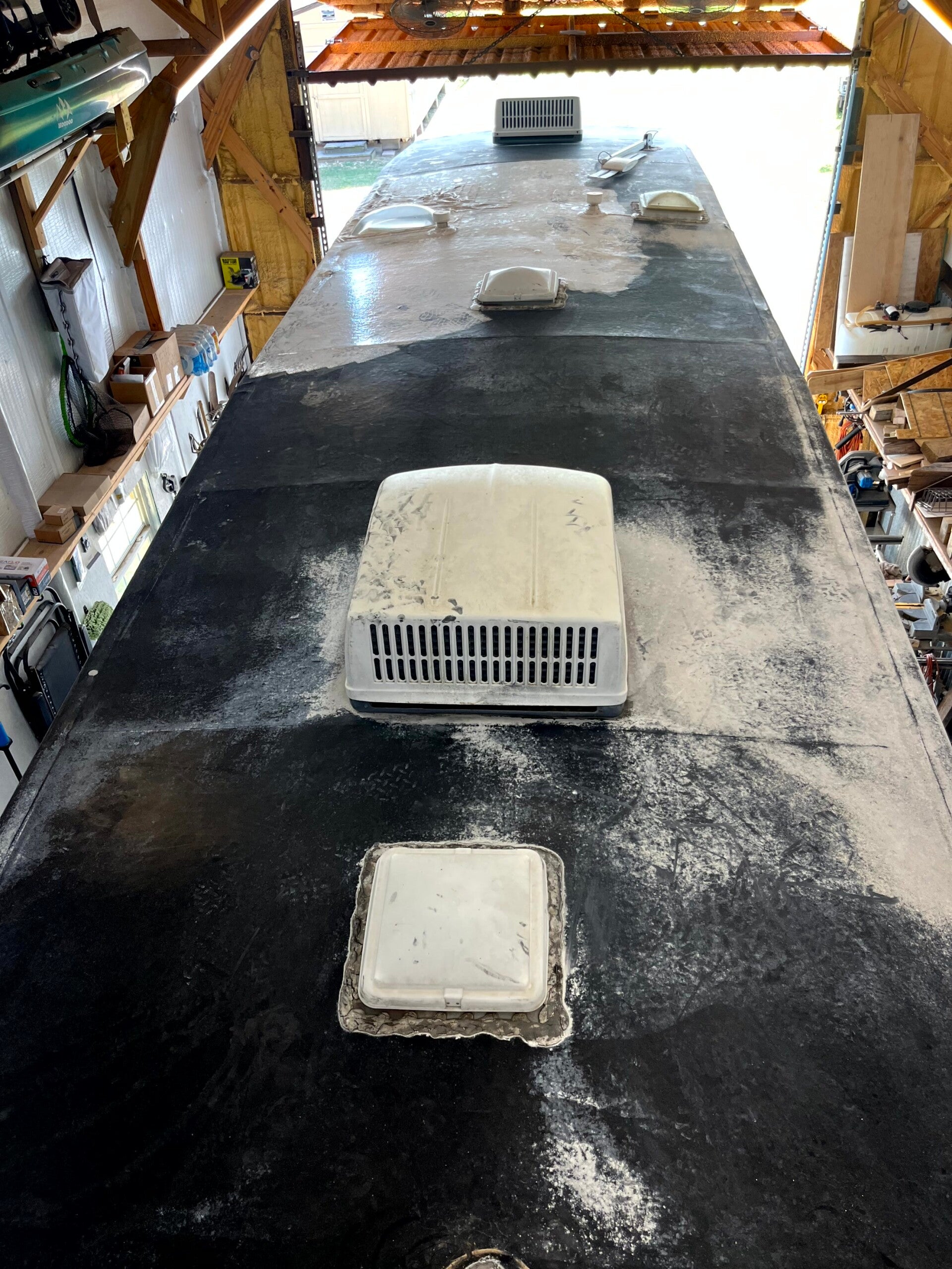 This particular roof was from a 15yr beautifully maintained RV that was kept undercover here in Needville, Tx. The rubber membrane still failed although it was covered most of its life. Instead of buying a new RV this customer went with a commercial silicone roof installed by Overalloutfitting. He now has a transferable 15yr warranty. I povide specific yr warranties not because the material will fail in a specific year, but only because it will need an additional coat around that time to maintain reflectivity. I'm being honest.