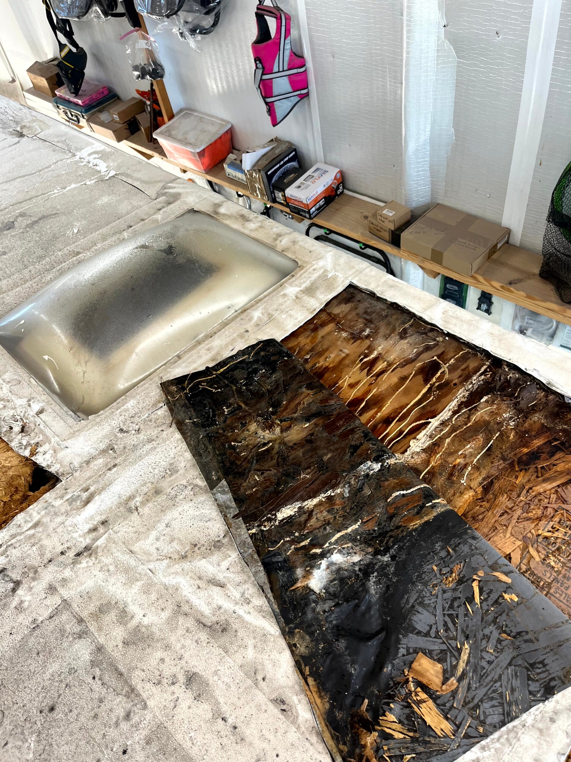 The owner of this rig made out well, as both the roof and AC required replacement. Numerous OSB panels were replaced, and most consumable roof components were eliminated. He now has a 10yr transferrable commercial silicone roof system and a mini split installed for easy, comfortable full-time RV living.